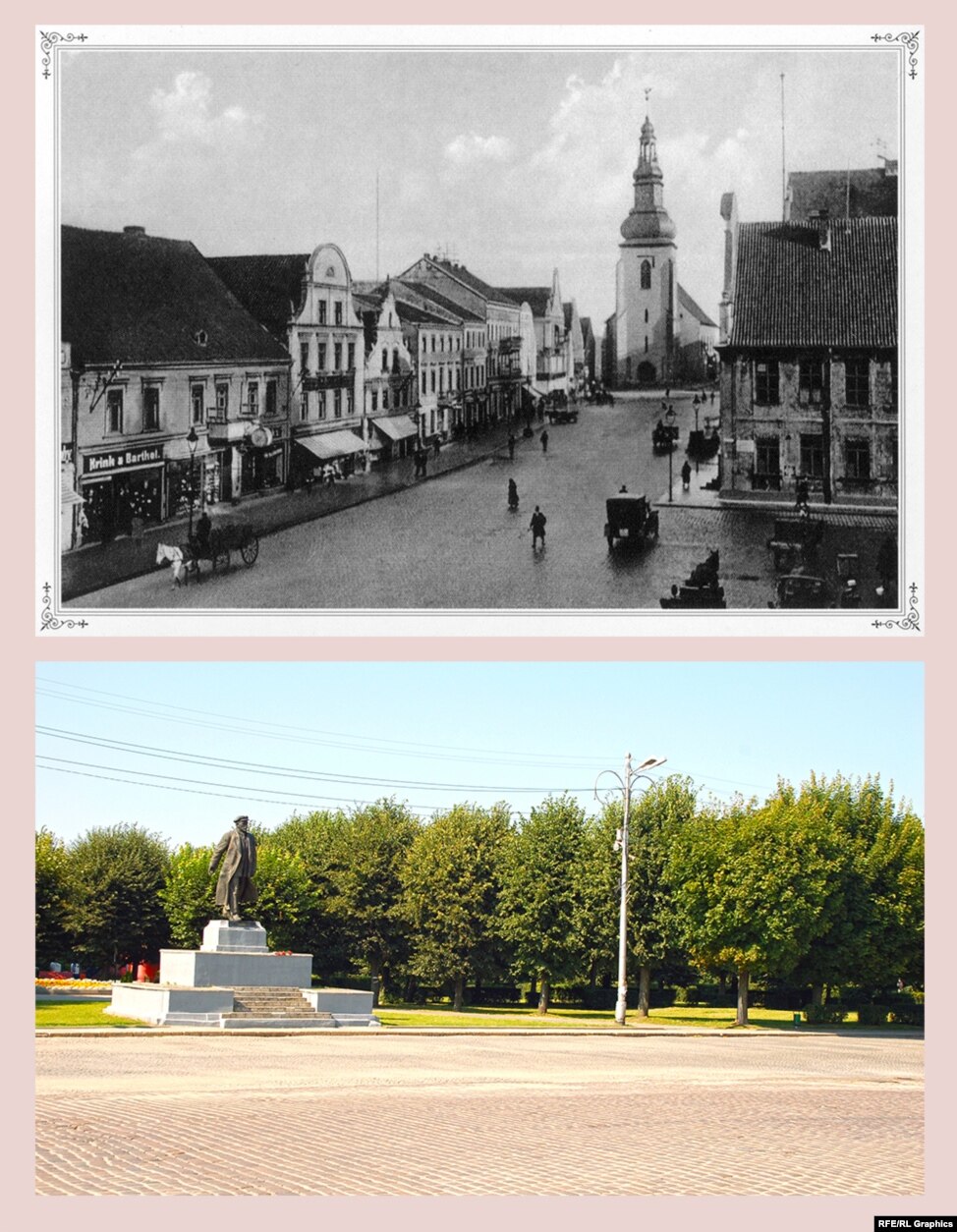 Война забрала у Черняховска центральную площадь, Старый рынок. Если весь остальной город был застроен в основном в эпоху Второго Рейха, то здесь сложился ансамбль XVII-XVIII веков с кирхой Лютера (1612-46), бюргерскими домами и Старой ратушей. Лютерова кирха сгорела во время Второй мировой войны, затем использовалась как склад и в 1976 году была снесена. Единственное, что о ней напоминает сейчас, – прилегавшие ворота в городской парк, возведенные в 20-е годы XX века. Памятник Ленину стоит на месте разрушенных домов. Троллейбуса, который ходил в городе между двух мировых войн и имел остановку на Старом рынке, больше не существует. Зато теперь здесь во множестве стоят такси (левее за кадром), водители скучают