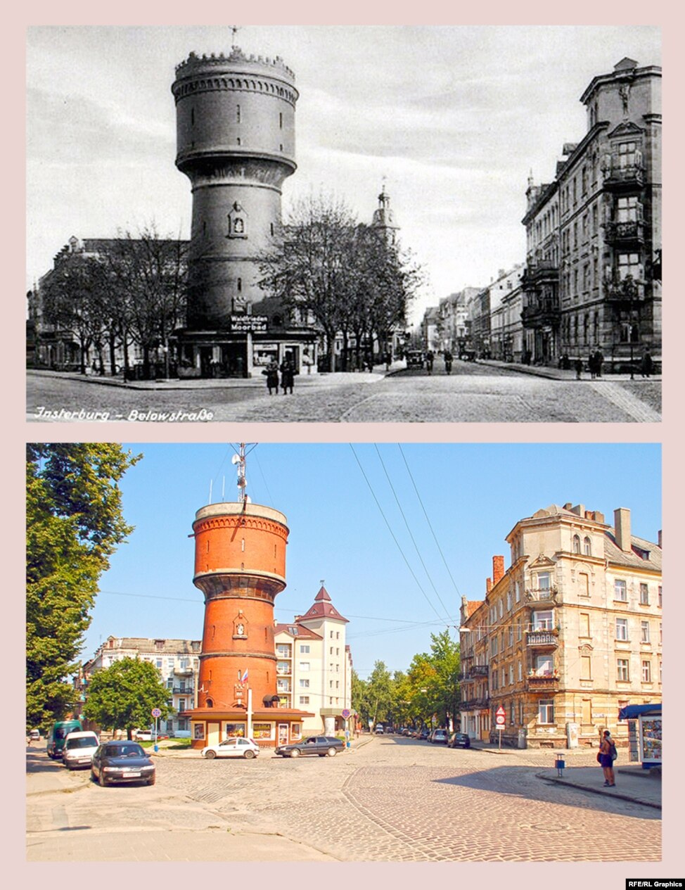 Водонапорная башня была построена в 1898 году с применением передовой конструкции водного резервуара по системе Отто Интце. Башня была важной частью городского водопровода, первоначально в верхней части имела зубцы. Во время русской оккупации Инстербурга в августе-сентябре 1914 года русские инженеры пытались запустить башню для подачи воды, в результате чего 28 августа 1914 года произошел взрыв. После ремонта городская водопроводная система была восстановлена. По прямому назначению башня не используется с конца 1930-х годов, сейчас внутри нее располагается городская телерадиокомпания. Круглый павильон у башни – постройка двадцатых годов XX века. До Второй мировой войны в ней располагался цветочный магазин.