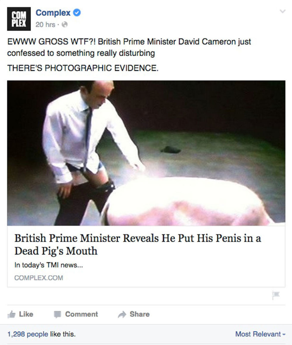 Как подчеркивает газета, Дэвид Кэмерон, будучи участником студенческого сообщества «Пирс Гэвестон» во время учебы в Оксфорде, совершил непристойные действия со свиньей. В частности, этого требовал так называемый ритуал посвящения в престижный клуб. Так, утверждается, что на вечеринке Кэмерон положил интимную часть своего тела в рот мертвой свинье.