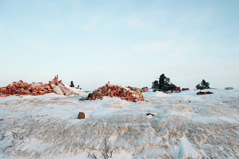 Туши оленей разделывают сразу. Работают голыми руками. Почти все идет на переработку. Рога экспортируют в Южную Корею и Китай, где из них делают муку для подкормки жемчуга на фермах. Из камуса шьют унтайки. Мясо продают преимущественно в Норильск.