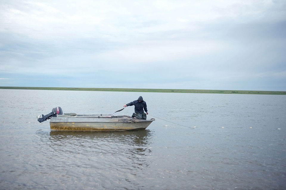 Через полтора часа мы уже мчались по реке Норилке в сторону озера Пясино, а оттуда на север по реке Пясина, впадающей в Карское море. Вместо заявленного катера — две открытые моторные лодки. Под колючими брызгами и шквальным ветром мы проделали более 200 километров. Останавливались в промысловых точках, располагающихся на берегу с промежутками в 50-70 км, и знакомились с жителями.