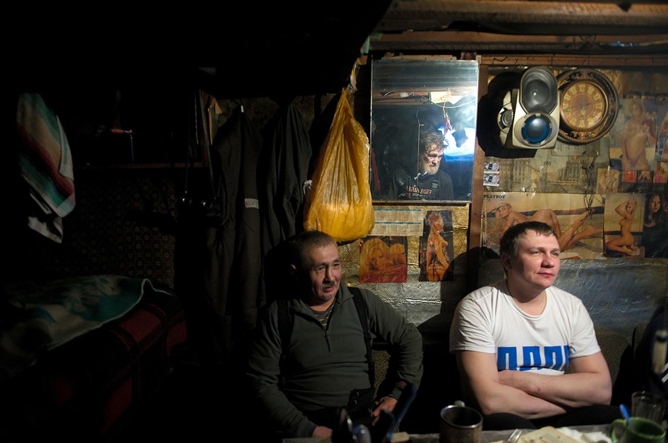 Зимника на промысел нет. Добраться можно на снегоходах, вездеходах или трэколах. Минимальное время в пути — около 8 часов. В трэколе мы плыли по кочкам, словно на большой резиновой лодке, качаемой волнами. Иногда в лучах прожектора, пробивающего тьму, мелькали зайцы и волки. Приехали ближе к ночи. Небольшой дом, одна комната, все спальные места сосредоточены вокруг печи-буржуйки. Там же стол.