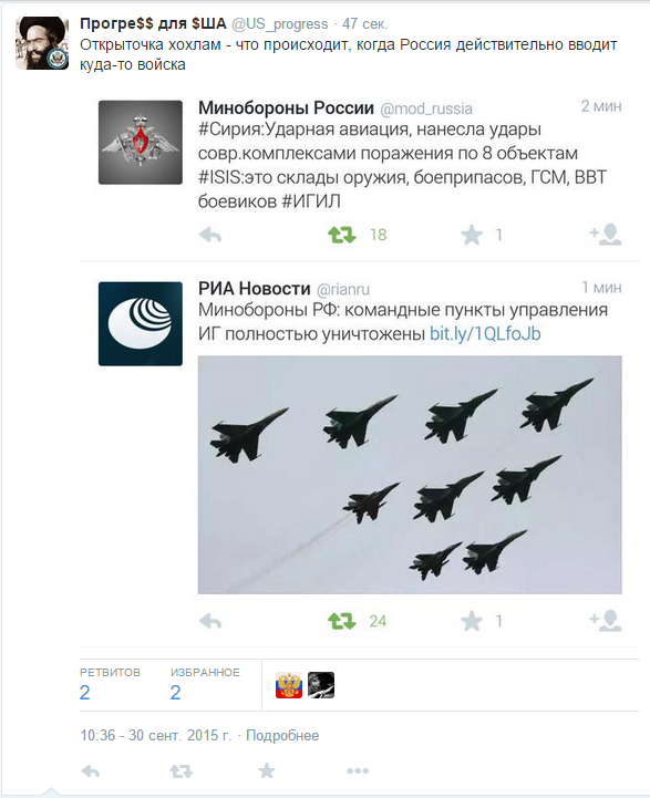 Ранее сообщалось, что нанесение самолетами российских Воздушно-космических силавиаударов по целям в Сирии не приведет к изменению стратегии, избранной международной коалицией против боевиков "Исламского государства" (ИГ).