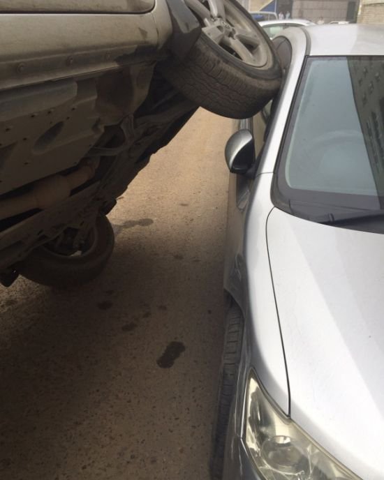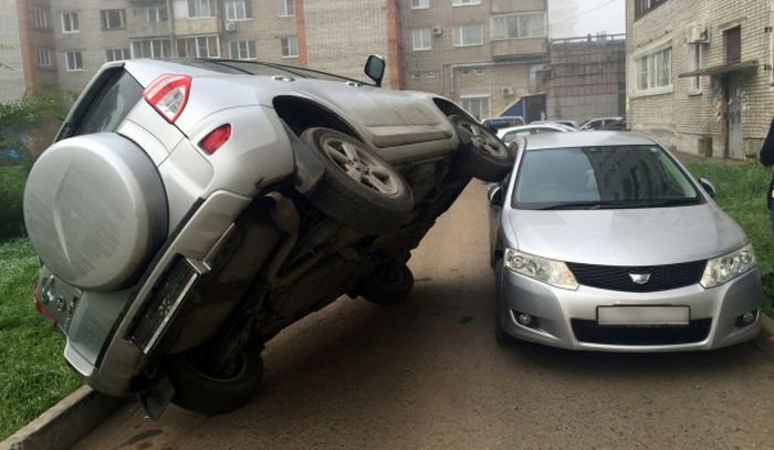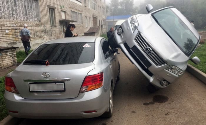 Необычное ДТП произошла сегодня утром. В Комсомольске-на-Амуре, во дворе дома №1 по улице Сидоренко девушка-водитель не смогла правильно рассчитать манёвр, проезжая по двору на своём внедорожнике «Тойота» и в итоге буквально заехала на припаркованную у обочины легковую «Тойоту».