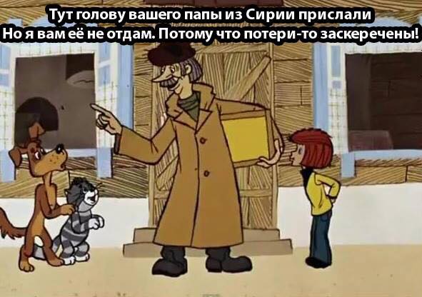 Но видимо уже готовится к открытию сельмаг, в котором стоят новенькие танки и БТР-ы, а г-н Путин репетирует новую речь, в которой «добровольцы» будут названы… как там было в Украине? — «шахтёры и трактористы», вроде так? А тут будут «крестьяне и священники», видимо так. Особенно священники, потому что телевизор бьётся в истерике, доказывая, что «именно из Сирии пошла русская вера!»