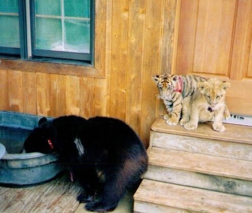 и медведь Балу живут вместе. Недавно всех трех переселили в новый вольер с деревянным домиком и искусственным озером,