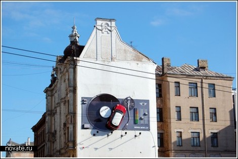 На одной из стен в центре Риги рекламируют автомобиль BMW Mini в виде проигрывателя с виниловой пластинкой, по которой едет рекламируемая машина. «Let's Mini» - звут слоган этой рекламной кампании.