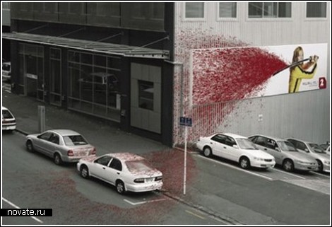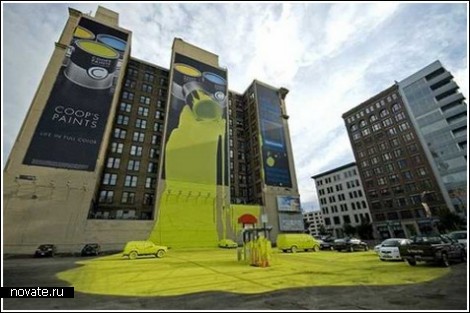 Схожий принцип использован и в рекламе красок компании Coop's paint. Одна из стен офисного здания этой фирмы выглядит так, будто там пролилась огромная банка с желтой краской. Ею залита вся стена и огромная часть парковки перед зданием. И даже несколько припаркованных машин не минула участь стать желтыми.