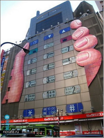 У этой необычной рекламы магазина электроники в Японии есть две цели. Первая - показать, что это именно магазин электроники. Вторая - информировать, какие товары на каком этаже можно купить. На кнопках этого огромного мобильного телефона указана вся эта информация.