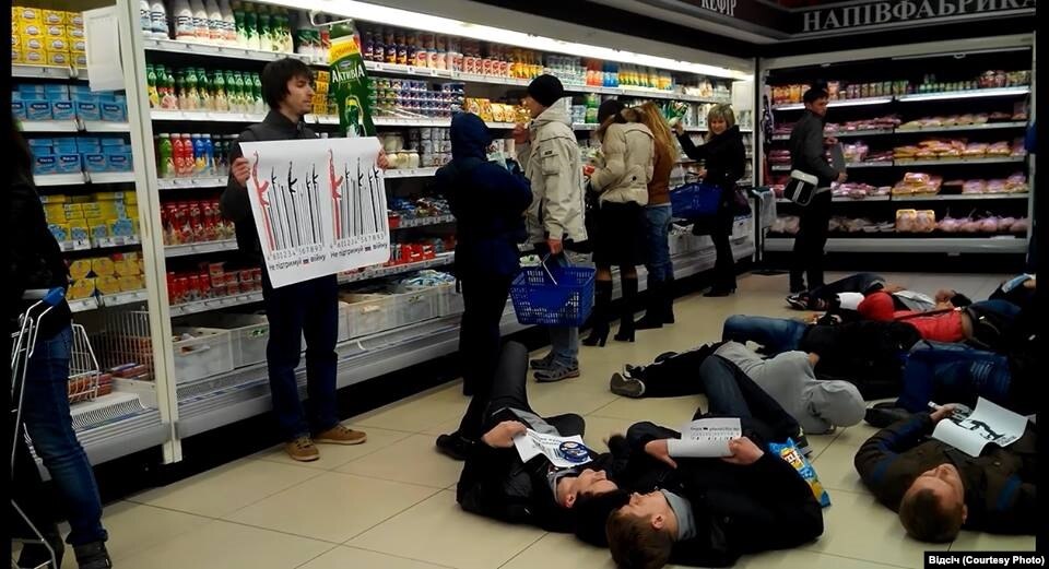 В марте на Украине прошло несколько десятков флешмобов с лозунгом "Русское убивает". Участники флешмоба приходили в продуктовые магазины, разворачивали плакаты с надписями "Российское купил — войну оплатил!", "Покупаешь 460-469 (штрих-код, соответствующий в основном товарам из России.— "Деньги") — платишь зеленым человечкам" и падали на пол замертво. Покупателям раздавали листовки с призывом к бойкоту российских товаров.
