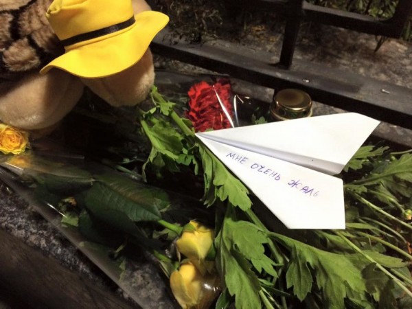 Также к посольству принесли бумажный самолетик с надписью на крыльях "Соболезнования близким от Киевлян". Группа молодых людей оставила у посольства фигурку ангела, сказав, что погибшие в небе становятся ангелами.