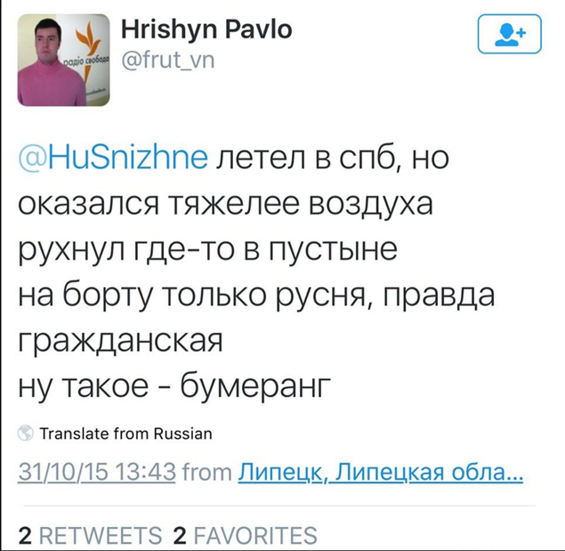 Кстати, сегодня в Египте ещё один инцидент с неисправным российским самолётом был. Там египтянам пришлось буквально машинами самолёт блокировать, а то пилот-придурок пытался взлететь несмотря на запрет http://by24.org/2015/11/02/air_authorities_in_egypt_blocked_wrecked_russian_plane/