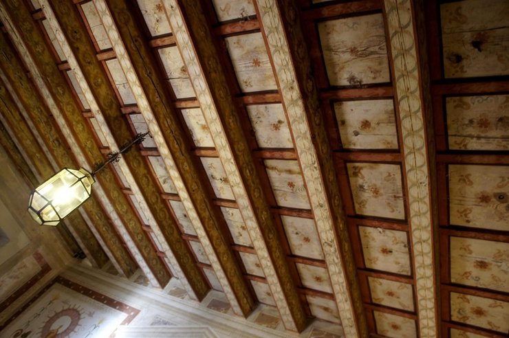 Над входом родовой герб семьи.Обратите внимание на потолок.Он деревянный с квадратными углублениями.А колонны создают иллюзию настоящих.
