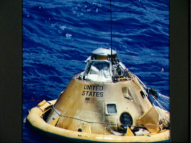 Никаких, простите, фейков и «макетов для тренировок» — вот как бы реальный аппарат после спуска, обгоревший, с астронотами Армстронгом и Скоттом внутри, после приводнения: