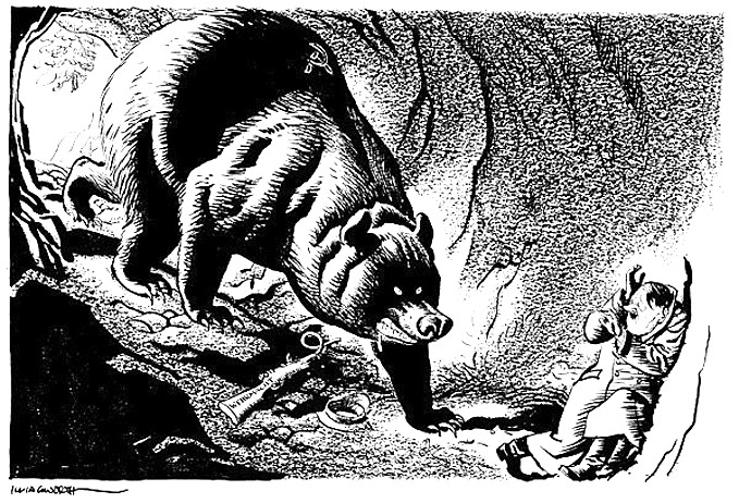 1960 год, жыдо-пиндосская карикатура о том, как советский медведь посягает на экспансию в целом ряде стран на глазах Дяди Сэма.