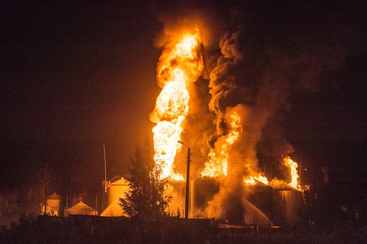 Емкости с горючим находятся на большом удалении друг от друга, потому что в случае пожара огонь не должен перекинуться на соседние резервуары. Кстати, вот как выглядит пожар на настоящем нефтехранилище.