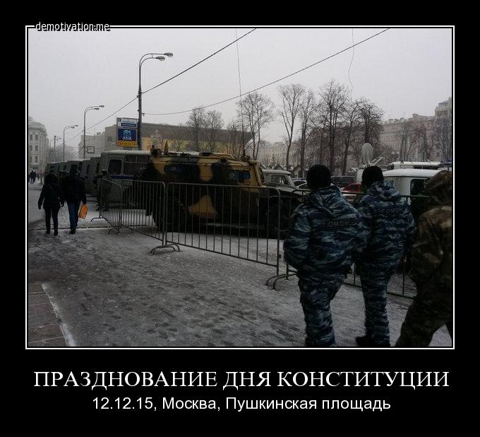 За Конституцию, не чокаясь. Сорока лет как не было! На Пушкинской отмечают День Конституции. Той, положив на которую (руку положив!), присягал президент. И как при Брежневе: празднующих немного, милиции больше. Правда, теперь она полиция, а демонстрантов все-таки больше, чем тогда. И Сахарова нет.
