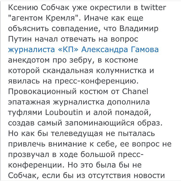 КП пиарит Зебру а Зебра тут же в ответ пиарит КП, ОДНОВРЕМЕННО идет опять вброс как бЭ шутя что Собчачка все же и Кремль это где то рядом