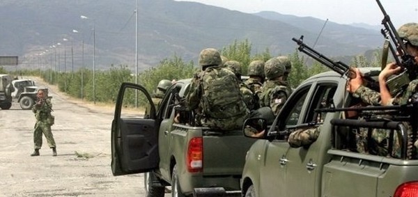 На фотографии видно, как один солдат ВС РФ с ручным пулемётом наперевес противостоит целой колонне мотопехоты ВС Грузии.