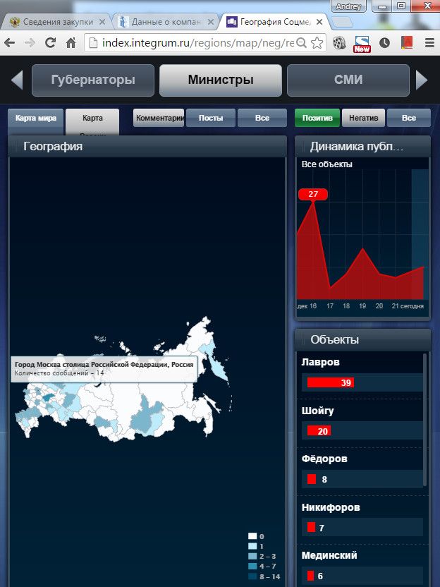 Чтобы опробовать некоторые функции системы, не обязательно носить погоны или быть чиновником. На сайте "Интегрум-медиа" можно в режиме реального времени отслеживать посты и комментарии в соцсети "ВКонтакте", а также в Twitter и LiveJournal по таким темам, как "министры", "губернаторы", "СМИ", "вузы" и "банки". В бесплатной версии работает и географическая привязка, и оценка интонации сообщений.