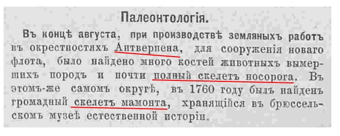 * В одной из пещер Англии, на высоте 80 футов над долиной, под днищем, покрытым сталагмитами, обнаружились кости слонов, носорогов, бегемотов, лошадей, оленей, саблезубых тигров, медведей, волков, гиен, лисиц, зайцев, кроликов… Аналогичные находки были сделаны во Франции. Трудно представить, что северные олени из снежной Лапландии и бегемоты с берегов тропической реки Конго жили бок о бок в Британии или Франции. Тем не менее, кости тех и других покоятся в одной и той же грязи одних и тех же пещер. Причём, эти кости не успели окаменеть, и входящую в их состав органику ещё не заместили минералы. Значит, гибель произошла не ранее чем 5-6 тысяч лет назад.
