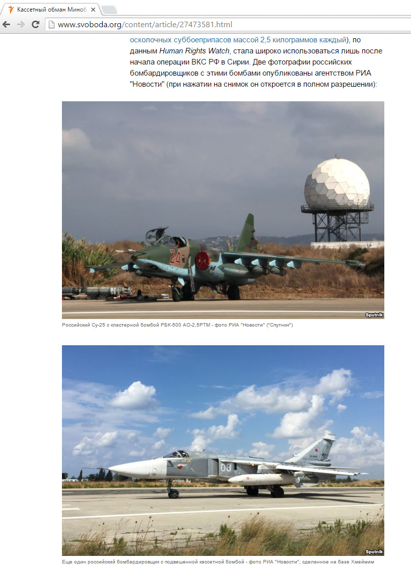 Радио Свобода вчера опубликовала новость по нашему расследованию, к которой приложила две фотографии в высоком разрешении из фотобанка РИА Новости, на которых совершенно ясно видны кассетные авиабомбы РБК-500 АО-2,5РТМ на авиабазе Хмеймим.