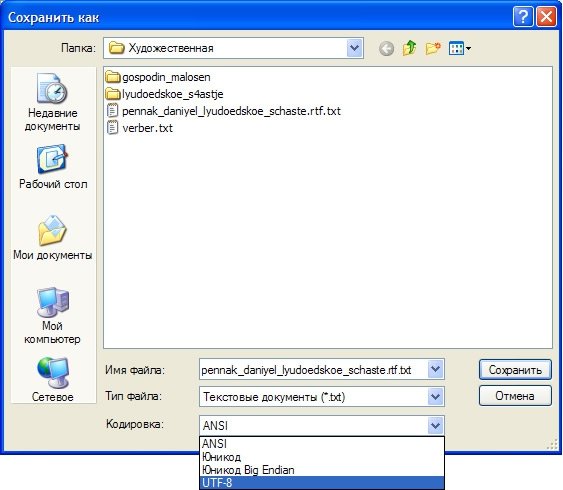Внизу экрана смените кодировку с ANSI на UTF-8 или в другую сторону.