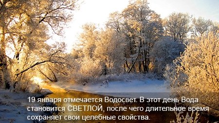 19 января отмечается Водосвет В этот день Вода становится СВЕТЛОЙ, после чего длительное время сохраняет свои целебные свойства. По обычаям принято искупаться в проруби. Другой, более "мягкий" способ получения здоровья от Светлой Воды - зачерпнуть ведром речной Воды и облиться в домашних условиях либо в защищённом от ветра месте. Сразу после купания в проруби следует БЫСТРО вытереться насухо и тепло одеться, затем продолжить праздник чаепитием в кругу друзей. Вода сегодня ВОЛШЕБНАЯ и даёт купающимся здоровье вплоть до Купалы летом и следующего Водосвета зимой.