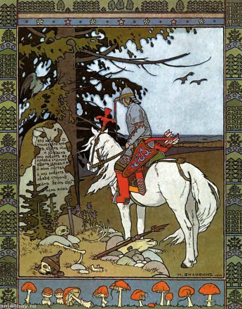 А это иллюстрация Билибина к русской народной сказке - "Направо пойдешь - коня потеряешь..." (ну и так далее по тексту)):