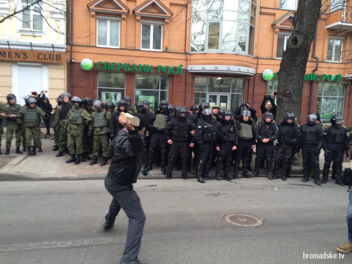 Полиции рядом не было, и погромщикам никто не препятствовал. Однако охрана здания Сбербанка России на Арсенальной улице была усилена сотрудниками спецподразделений. Несмотря на это, митингующие забросали офис камнями и кричали: «Ганьба!» (с украинского — «позор»).