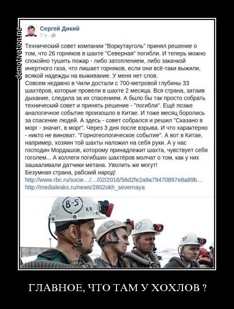 Так уж вышло, что я накануне смотрел по одному из федеральных каналов наипопулярнейшее вечернее ток-шоу. Черт меня дернул, что называется. Передача длилась с рекламой три часа. Но только на третьем часу один из гостей студии, прежде чем начать говорить, выразил соболезнования семьям погибших горняков и спасателей. А ведущий пояснил, что речь идет о трагических событиях в Воркуте. Пояснение было совершенно необходимо, судя по всему. Потому что о гибели десятков наших граждан на российской территории, телезрители запросто могли не знать! Ведь до этого момента дюжина экспертов два часа на все лады обсуждала Сирию. Два часа! Обрушивая на нас всю тамошнюю географию и родоплеменную структуру. Эрдоган, Обама, Путин, Алеппо, ДАИШ (запрещена в России) и хрен знает что еще. А вот про то, что на российской шахте погибли российские граждане – на третьем часу программы и то случайно.