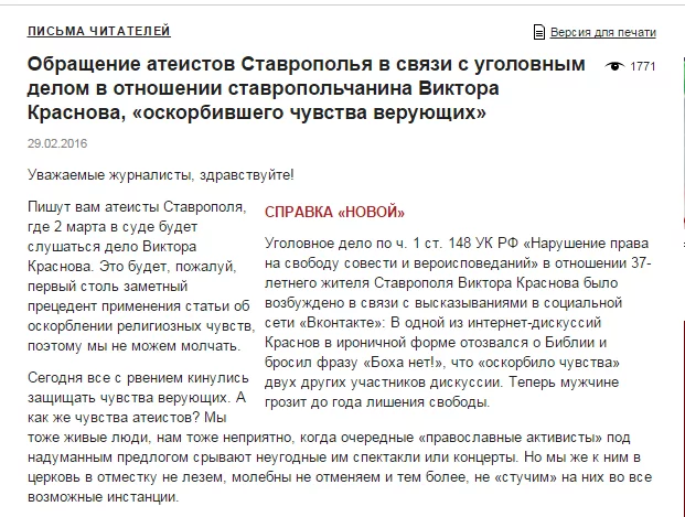 Безусловно, права верующих должны быть защищены законом, но тем же законом должны быть защищены и права неверующих, которых у нас тоже достаточно. И именно об этом сказано в 28-й статье действующей Конституции РФ: «Каждому гарантируется свобода совести, свобода вероисповедания, включая право исповедовать индивидуально или совместно с другими любую религию или не исповедовать никакой, свободно выбирать, иметь и распространять религиозные и иные убеждения и действовать в соответствии с ними». Почему же Краснову было отказано в конституционном праве иметь и распространять свое атеистическое убеждение — «Бога нет». В этом контексте процесс в Ставрополе выглядит как некая судебная казуистика и очень нехороший прецедент.