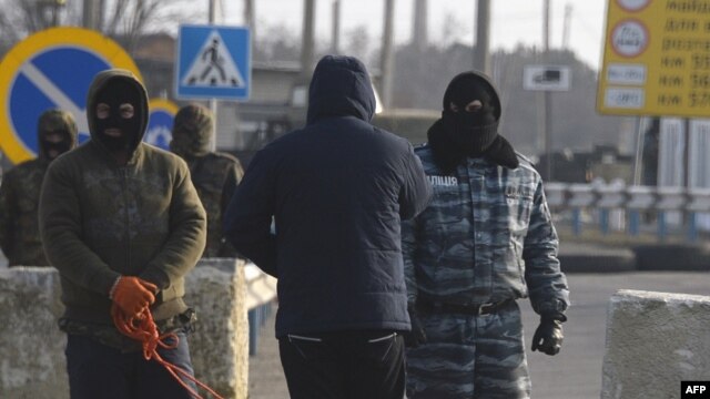 Пророссийские боевики в масках на установленном на Чонгаре блок-посту, север Крыма, 7 марта 2014 г.