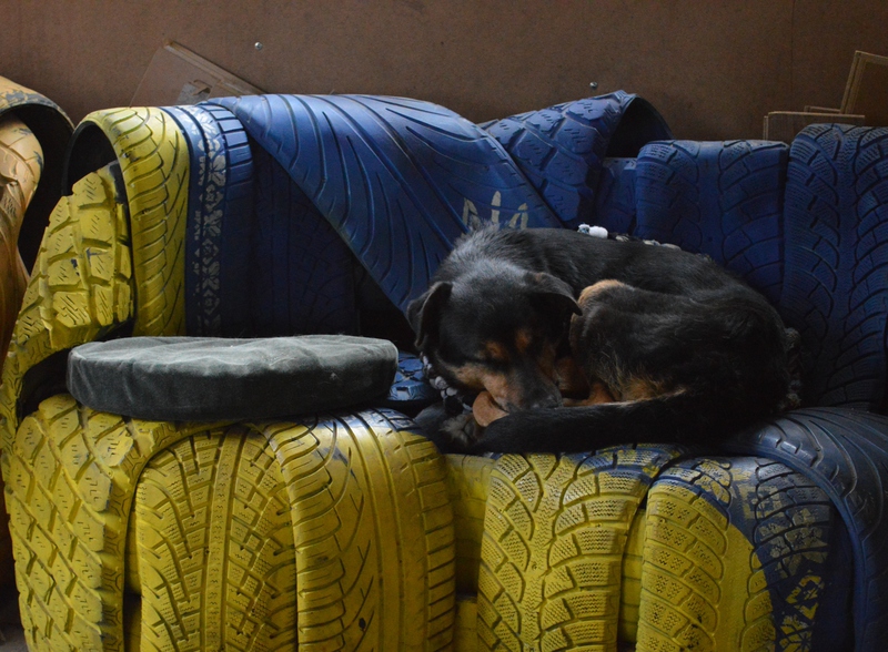 Внутрь не сразу пускают собаки. Здесь их временный дом. Животные спят на разукрашенных в национальные цвета креслах из шин. За швейной машинкой девушка делает подушки для питомцев, отвлекаясь на играющего сантиметром кота.