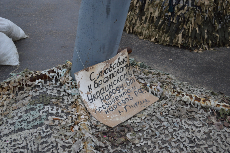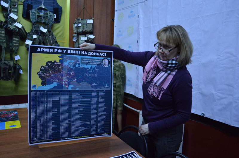Напоминать о войне — цель организаторов сине-жёлтой палатки Евромайдана на площади Свободы. Внутри неё постоянно дежурят активисты. На улице — стенды с фотографиями событий на Майдане и на востоке страны, портреты погибших. Рядом — использованные боеприпасы.