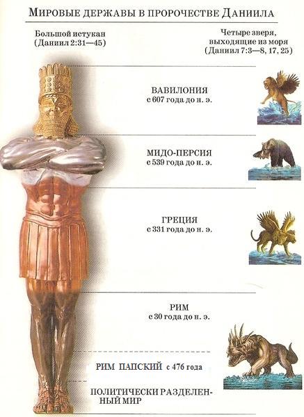 Все мы хотим знать, что будет в будущем: - когда прекратятся войны, вражда и ненависть между народами, беспокойство за завтрашний день - когда мы обретём мир, любовь и безопасность БИБЛИЯ ОТВЕЧАЕТ НА ЭТОТ ВОПРОС. Ибо никто из людей не может предсказать будущее, а ТОЛЬКО БОГ. Древние государства в пророчестве Апостолы обычно ссылались на исполнение пророчеств ( 2 Пет 1.16,19 ). КНИГА ПРОРОКА ДАНИИЛА дана для изучения в последние дни ( Дан 12.4 ). О её важности говорил Сам Христос ( Матф 24.15 ). Будущее было предсказано в пророческом сне царя Навуходоносора ( Дан 2.1 ). Бог в ночном видении открыл Даниилу сон и его значение ( ст.17-19 ). Даниил сказал царю о всемогуществе Бога Живого, знающего то, чего не знают мудрецы ( ст.27,29 ) и представил царю подробное описание сна ( ст.31-35 ). Установлено, что невозможно выяснить то, что снилось человеку, если он этот сон забыл, без помощи Всевышнего, Всеведущего и Всемогущего Бога. ТОЛКОВАНИЕ СНА: 1. Золотая голова истукана ( Дан 2.36-38 ) - Вавилон ( 604 - 538 до н.э. ). Один из русских историков пишет, что ни одно из царств до Вавилона не имело высшего могущества и силы, а также роскоши и великолепия ( Иер 51.7,13 - 604 - 561 - правление Навуходоносора ). 2. Однако Вавилон, «краса царств», будет ниспровержен Богом, «как Содом и Гоморра» ( Ис 13.19 ). Его место должно занять другое царство ( Дан 2.39 ). Это грудь и руки истукана - Мидо-Персия ( 538 - 331 ). Не будь это откровением Божьим, Даниил сомневался бы и не сказал бы об этом грозному царю. Так и произошло, как он сказал. Царь Кир захватил Вавилон и в 538 г. положил конец всемирному вавилонскому государству. При этом последний царь Валтасар погиб. 3. На смену Мидо-Персии приходит третье царство ( Дан 2.39 ). Это чрево и бёдра истукана - Греция ( 331 - 161 ).