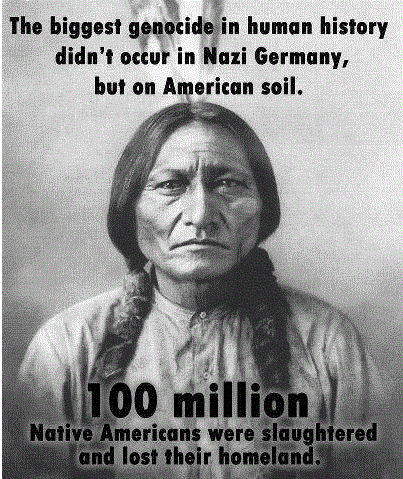 "„Во время заселения нынешней территории Америки было убито где-то 100 млн. индейцев. Оккупанты совсем не считались с хозяйскими правами и племенными интересами индейцев и буквально с самого начала объявили им войну на истребление." (Ди Браун "Схороните моё сердце у Вундед-Ни". История американского Запада, рассказанная индейцами.)