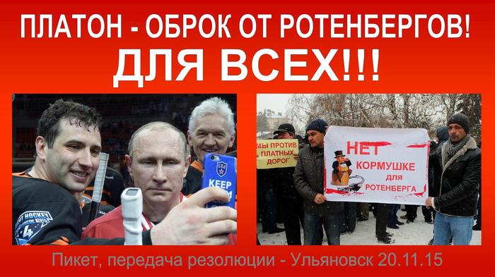 Участники митинга пришли с плакатами «Платон на свалку, правительство — в отставку», «Все лучшее — детям… Ротенбергов», «Платон, уходи», «Хватит кормить Ротенбергов».