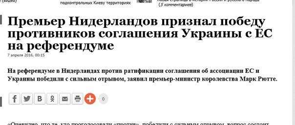 Блин! Явка составила 32.2 процента. 61% против ассоциации с нами. Да что же это такое?! Не надо нам в их ЕС! Мало их, козлов укуренных, взрывали в Брюсселе. Но ничего, скоро аллахи-акбары доберутся до них, сытых и спокойных. Понял четко – Украине надо вступать сразу в НАТО. Быстро, без всяких референдумов. Пусть дают нам много «джавелинов» и тогда мы разнесем пол Европы к е…ням. Еще ядерное оружие сварганим по-быстрому и тогда эти геи у нас попляшут. Кровавыми слезами будут умываться. Побратимы п...