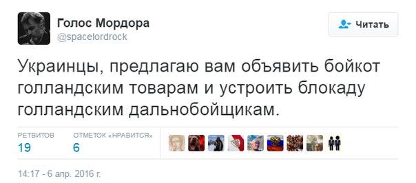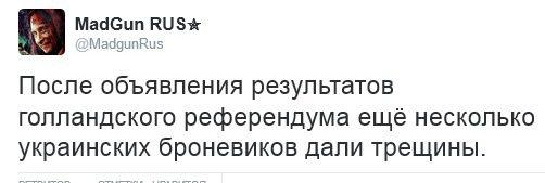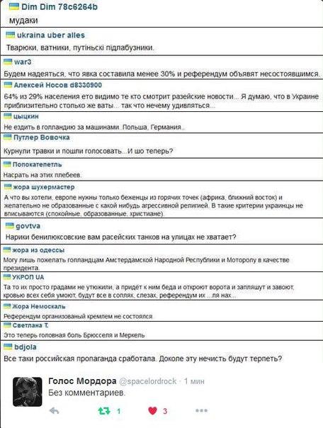 Так, что там в Роттердаме? А там полная победа Украины! Низкая явка и вроде большинство голосуют «за». Лещенко опять кого-то спросил – так он за Украину! Люблю наших велосипедистов, которые своими обтянутыми задками сделали для ассоциации больше, чем все органы власти нации вместе взятые. Х…ло терпит очередное, сокрушительное поражение! Просто предвкушаю, как завтра зайду на «Фейсбук» и заставлю «кацапов» кровью умыться на их пабликах! Будут у меня жрать кал, проклятые кремлевские боты. Голландия с нами!