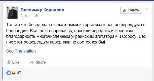 Автор пишет, что некоторые сторонники соглашения с Украиной пытались превратить голосование в референдум по Владимиру Путину. Другими словами, вопрос для населения ставился так: "Верна ли политика Брюсселя по отношению к Москве. Отрицательный результат, в итоге, показывает, что стратегия, выбранная руководством ЕС после событий двухлетней давности на Украине, широкой поддержки так и не нашла.