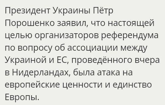 Он добавил, что результаты референдума ставят под вопрос договороспособность Евросоюза. «У нас переговоры об ассоциации продолжались 7 или 8 лет, потом происходила ратификация. А потом встают Нидерланды и говорят: "Вы знаете, у нас тут референдум, извините, надо возвращаться к переговорам"», — пожаловался дипломат.