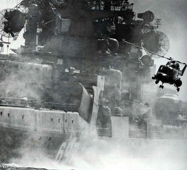 - Многоцелевой вертолёт Westland Lynx Королевских ВМС пролетает рядом с советским большим противолодочным кораблём пр 1134-А "Адмирал Нахимов" (шифр «Беркут-А», кодовое обозначение NATO - Kresta II class).