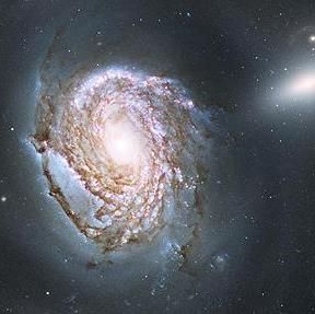 Галактика содержит насыщенные линии пыли и газа, находящиеся около ее центра. Ее очертания хорошо видны на фоне сияющих новообразованных звездных кластеров и переливающихся розовых облаков водорода, что характеризует продолжающееся формирование звезд.