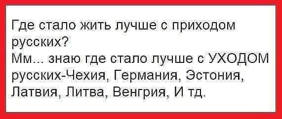 Не понимают латвийцы, какого счастья лишились. Ведь могли же жить нормально, по-русски! Обогащать свою верхушку, умирать в СИЗО от дубинок и паяльников на яйцах, умирать где-нибудь на Донбассе или в Сирии, оплачивать туры своих чиновников в Монако, платить за крышевание браткам и стоять в пробках, пока по кривым дорогам едут хозяева, радоваться новым коррупционным вершинам своего политического руководства. Кроме того, могли бы сбивать гражданские лайнеры и бомбить детей в Украине и Сирии – чувствовать сопричастность к великому, короче. Глупцы латвийцы. Ничего не понимают.