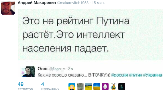 Но мне все-таки кажется, что новые данные опросов доказывают, что нормальные законы политики на самом деле действуют в России, по крайней мере в определенной мере. Экономика переживает тяжелый период, и правительство становится менее популярным, как и следовало ожидать. К рейтингам Путина слишком часто относятся как к некой тотемической, неизменной константе, как к данным, которые подготавливаются в каких-то неведомых лабораториях и которые почти никак не связаны с политической реальностью в России. Сказать с уверенностью, действительно ли это так, невозможно, особенно если вспомнить о периоде спада популярности Путина с 2009 по 2013 год, в результате которого его рейтинг одобрения постепенно снизился до 60%.