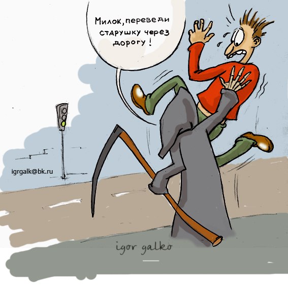 Дядька отходит метров на 25-30 и стоит ждет. Капюшон на голове, в руке коса. Борт катит мимо, аэродромщик приветливо машет экипажу. Все кто в самолете видят машущую фигуру…