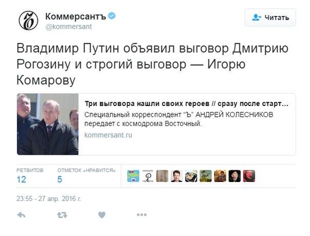 Тем не менее, присутствовавший на космодроме президент России Владимир Путин объявил выговор вице-премьеру Дмитрию Рогозину, строгий выговор гендиректору "Роскосмоса" Игорю Комарову и предупреждение о неполном служебном соответствии гендиректору НПО автоматики (НПОА) имени академика Семихатова Леониду Шалимову. Последний накануне подал в отставку.