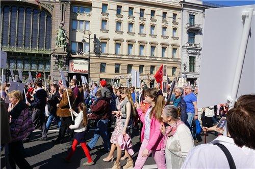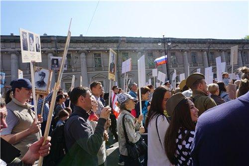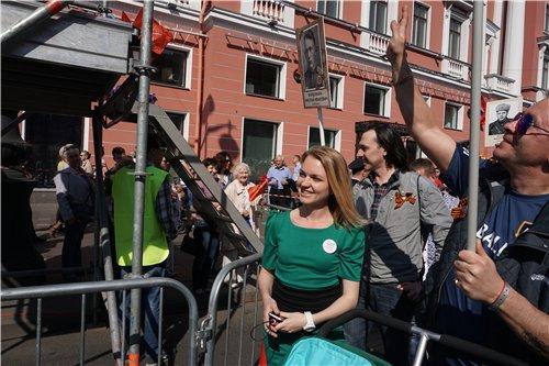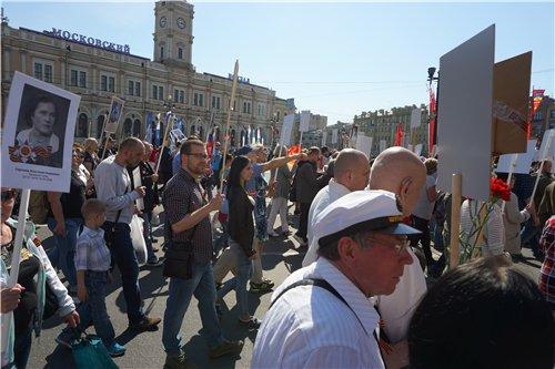 Не фотографировала - показалось святотатством нацеливать в их сторону объектив. Видимо, тараканы зашептали :-) Люди с медалями стояли, сидели по обочине. Их поздравляли шедшие в колонне, дарили цветы. Алые гвоздики. Такие, помню, дарили приходящим к нам в школу с рассказами о войне в 80-ые. Пара таких женщин случайно попала в кадр. Но лица их нужно было видеть там, в реальности. Там, где эти люди улыбались. Очень много детей. И я не заметила пьяных, хотя муж прокомментировал, что кто-то "подготовился" и блеснул флягой. Мы прошли половину пути, малышня устала, свернули. На окрестных улицах тоже много людей и светлых лиц. Хотелось идти со всеми до Дворцовой, а ведь я не любитель толпостворений, даже на салюте последний раз была лет 20 назад... Сегодня пойдём. Всей семьёй. Спасибо нашим прадедам и прабабкам за эту возможность. Низкий поклон.