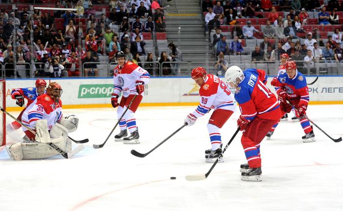 Владимир Путин появился на льду после перерыва, во втором периоде. Он заменил Шойгу в первой тройке и сразу же отправился в атаку. На первую шайбу у президента ушло меньше четырех минут.